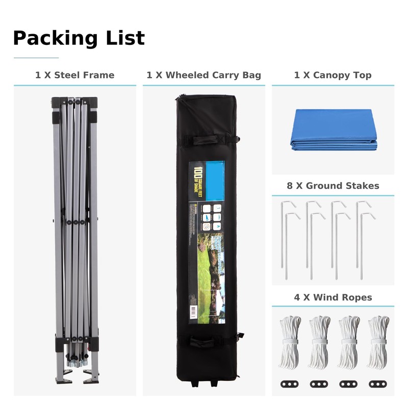 - 【Bigger Shade】10x10ft straight leg pop up canopy provides 100 square feet of cooling shade, big enough for about 10 people to sit under.Three different height settings allow you to pick the height that best suits your needs. Great for camping, picnic, barbecue, party and other outdoor events
