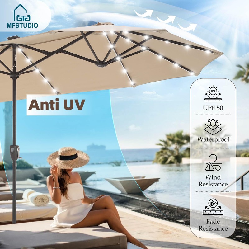 MFSTUDIO 13ft Double-Sided Patio Umbrella w/Solar Lights, Outdoor Table Rectangular Umbrellas w/ 120 LED Lights, Hand Crank for Backyard Pool, Beige