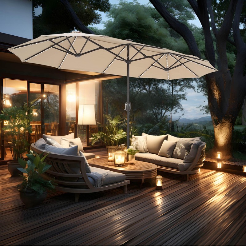 13ft LED umbrella provides maximum multi-position shade. It is perfect for outdoor patio dining tables, hammocks, deep seating patio furniture set and more. The umbrella is made of 100% polyester. Each umbrella has a durable steel pole and 12 steel sturdy ribs. Such a product looks great and is ready to withstand the elements of the outdoors. Solar-powered LED to keep conversations sparked even after dark. Fun in the sun and under the stars is only an umbrella away!