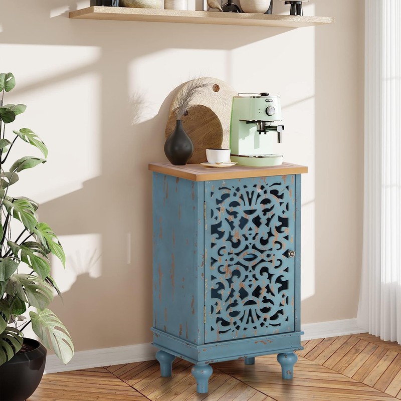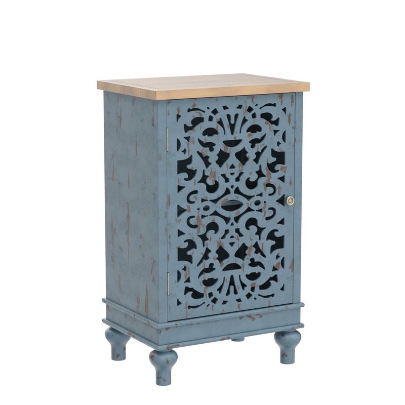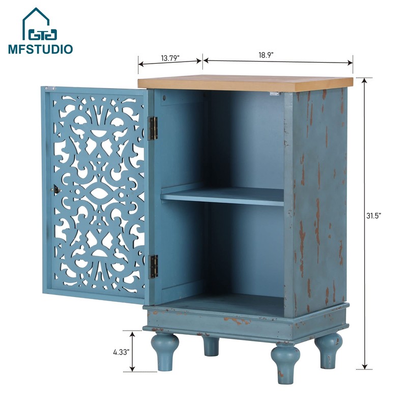 MFSTUDIO Small Accent Storage Cabinet with 1 Door, Farmhouse Hollow-Carved Floral Distressed Decorative Wood Cabinet Nightstand Side Table Sofa Table for Living Room, 13.8" Dx18.9 Wx31.5 H, Blue