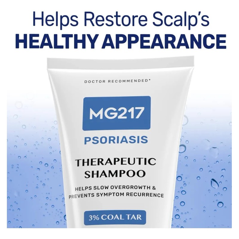 MG217 Therapeutic Shampoo para psoriasis contiene alquitrán de hulla al 3%, recomendado para aliviar síntomas persistentes como escamas, picazón y enrojecimiento en el cuero cabelludo. Es un tratamiento clínico efectivo y aprobado para uso frecuente.