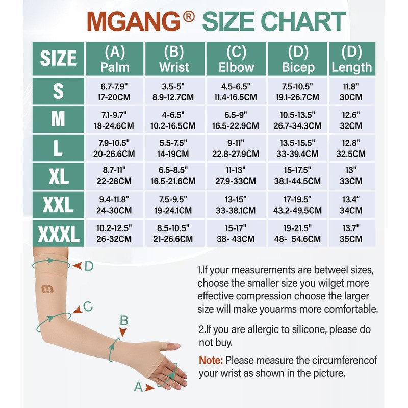 - Compresión graduada única: la compresión específica es el factor clave de una recuperación rápida. La manga de compresión MGANG de 20-30 mmHg ofrece una acción de compresión en el brazo, más grande en la muñeca, disminuyendo gradualmente hacia el brazo, hacia el corazón, la compresión graduada proporciona un gradiente de presión de masaje sobre el tela hinchado para ayudar a reducir la hinchazón en los brazos causada por un bloqueo del sistema linfático; proporciona compresión terapéutica firme para el manejo de linfas moderadas a severas edema.
