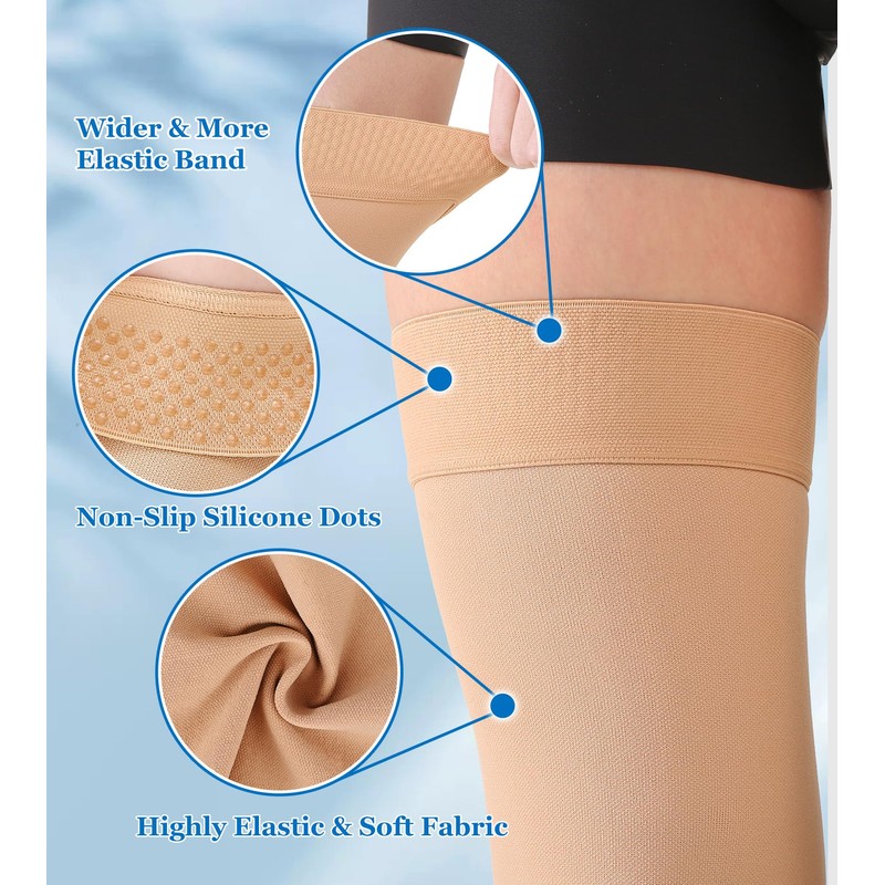- ✅【All Day Comfort】- Silicone grip dot-top lining prevents rolling and slipping, which helps the thigh high support socks stay in place throughout the day; High-quality fabrics - 70% Nylon, 30% Spandex - air-covered spandex thicker yarn soft touch, comfortable all day wear. Toeless design for inspection, increased comfort, and sandal footwear; Moderate support, unisex thigh highs, Doctor-recommended, MGANG 20-30 mmHg graduated compression thigh high support stockings!