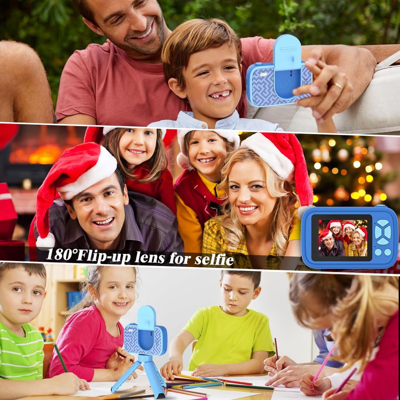 - Flip Lens & Selfie Mode: Equipped with a 180° rotating flip lens for fun selfies and group photos, plus a detachable tripod stand for stable shots. Dual front/back cameras capture 1080P HD photos and videos.