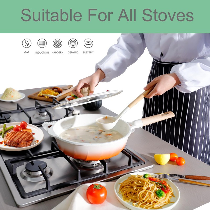 - 【Suitable For All Stoves】:to let our nonstick frying pan meet the needs of more families, we specially Added and enlarged the induction base delivers quick and evenly heat up and compatible with all stovetops, including Halogen Stoves, Gas, Ceramic, Oven and Electric Stoves.