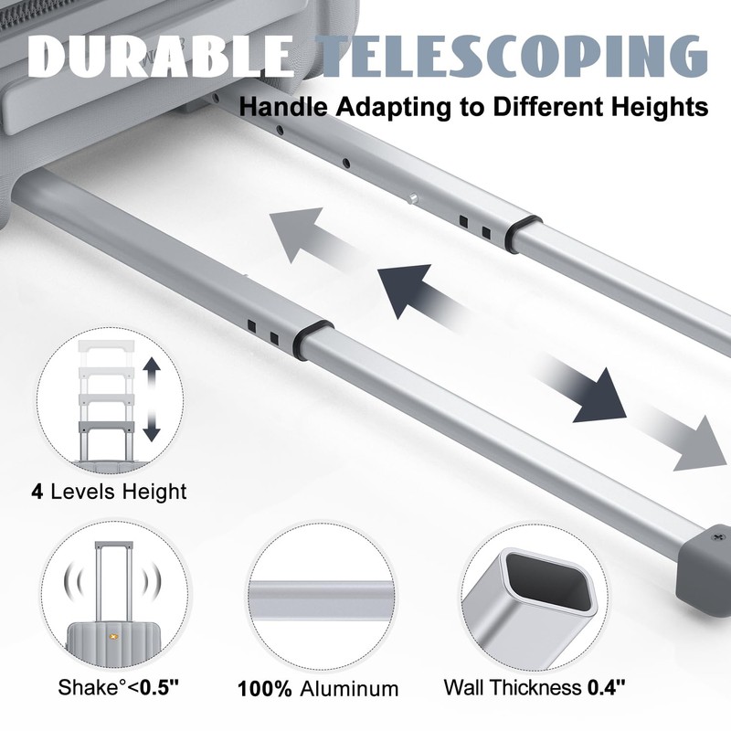 - ADAPTABLE & SECURE: The telescoping handle adjusts effortlessly to different heights. Crafted from sturdy 100% aluminum alloy, it guarantees stability. TSA approved carry on luggage offers airport ease and financial security.