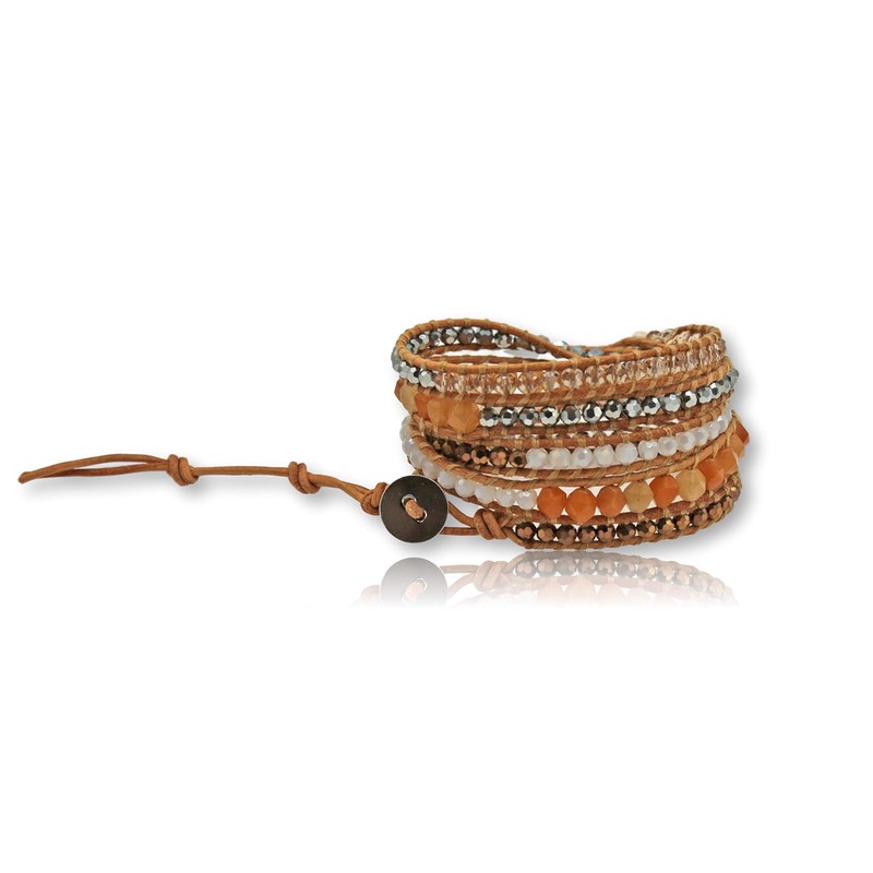 - GENUINE LEATHER: each stone and petite crystal bead is carefully stitched/crafted on genuine tan-color raw edge leather.