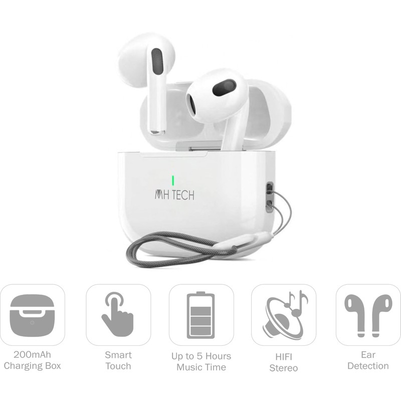 MH Tech Wireless Earbuds, Bluetooth, HiFi Stereo with Heavy Bass, Wrist Strap, Wireless Charging