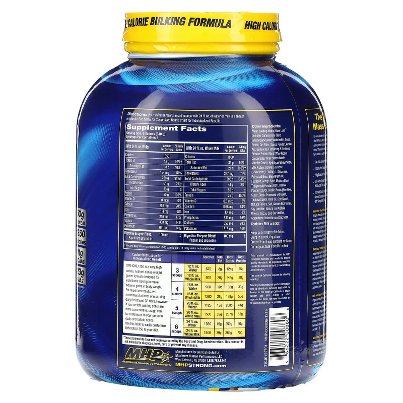 High Calorie Bulking Formula Gain Up to 18 lbs Mass in 5 Weeks!^ The Ultimate Mass Building Weight Gainer! Powerful Gains in Hard, Dense Muscle Mass Enhances Strength & Speeds Recovery 50 g Protein 1350 Calories 11 g BCAAs* 23 g EAAs* Naturally & Artificially Flavored Informed Choice, We Test You Trust Dietary Supplement The Ultimate High Calorie Mass Building Weight Gainer! For over a decade millions of athletes have trusted Up Your Mass® to help them add extreme muscle mass, strength and speed recovery. Now, MHP brings the next generation in mass building excellence with Up Your Mass XXXL 1350! This scientifically advanced mass packing formula is designed to complete your nutritional program and is so powerful, it can help pack on up to 18 lbs. of mass in just 5 weeks! The superior quality and quantities of muscle building nutrients in UYM XXXL 1350 makes it the ideal weight gainer for anyone trying to pack on quality mass quickly. 50 g Fast-Acting and Sustained Release Protein Blend 1350 Nutrient Dense Calories 250 g Mass Load Carbohydrates Zero Added Sugar Plus Healthy Carbs from Sweet Potato, Oat Fiber and Quinoa Informed-Choice Certified and Tested for Over 200 Banned Substances on the WADA list. Produced in a GMP Compliant Facility. 50 g Protein - Fast & Sustained Release Protein Blend: A highly advanced protein matrix loaded with 50 g of fast digesting (whey protein concentrate, whey protein isolate and hydrolyzed whey protein) plus slow digesting proteins (micellar casein and milk protein) provides both fast and long-term nitrogen retention benefits. UYM XXXL 1350 is also loaded with mega amounts of Glutamine and Branched Chain Amino Acids (BCAAs, leucine, isoleucine and valine) in every serving - all of which are critical for muscle building, strength and recovery from workouts. MASS Load™ Complex Carbs: The type and quality of carbohydrates used in any weight gainer will determine the type and quality of mass you pack on. Only UYM XXXL 1350 contains Mass Load, a unique agglomerate of complex carbohydrates (microparticulated maltodextrin, sweet potato, oat fiber and quinoa) that helps optimize the anabolic effect of insulin, allowing your body to build dense, high quality muscle mass. The advanced Mass Load carb blend also gives you sustained energy, fast glycogen replenishment and helps keep blood sugar levels stabilized within the normal range. And, unlike much of the competition, UYM XXXL 1350 has zero added sugars. Fatty Acid Complex: Most weight gainers make the crucial mistake of ignoring one of the most important macronutrients for mass building - dietary fat. Fatty acids offer numerous benefits including promoting healthy testosterone levels within the normal range; slowing digestion for a more stable insulin and glycemic response; enhancing nutrient absorption, especially of fat soluble vitamins; and supporting muscle strength and recovery. UYM XXXL 1350 also offers a variety of the right kinds of fats for mass building, including palm oil, flaxseed, borage seed, MCT powder and CLA. Tastes Great, Mixes Instantly! UYM XXXL 1350 is a high quality, great tasting weight gainer. It mixes instantly in a shaker (no blender required) with water or milk so you can feed your muscles high quality calories immediately after training and throughout the day! Start gaining maximum mass now with UYM XXXL 1350! ^If your current caloric intake and workouts have you at a weight gaining roadblock (maintenance), then look no further than UYM XXXL 1350. By taking one serving of UYM XXXL 1350 with 24 fl. oz. of whole milk daily - on top of your normal maintenance calories - you will provide an extra 12,600 calories per week. With this added caloric load, you could pack on up to 3.6 lbs. per week - continue for 5 weeks and you could pack on up to 18 lbs. and be bigger and stronger than ever before! Based on calculation of 3,500 calories per pound bodyweight. *Natural from proteinSUGGESTED USE:
