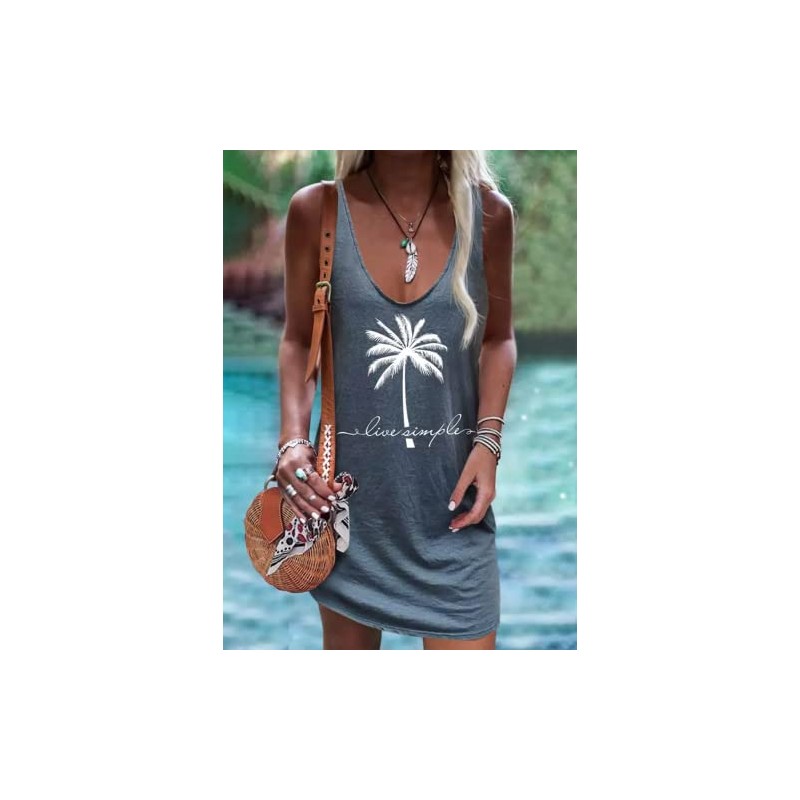 1x Live Simple Coconut Tree Sleeveless Mini Dress Sunshine sand beach Mini Dress Women's Summer Casual V Neck Mini Dress