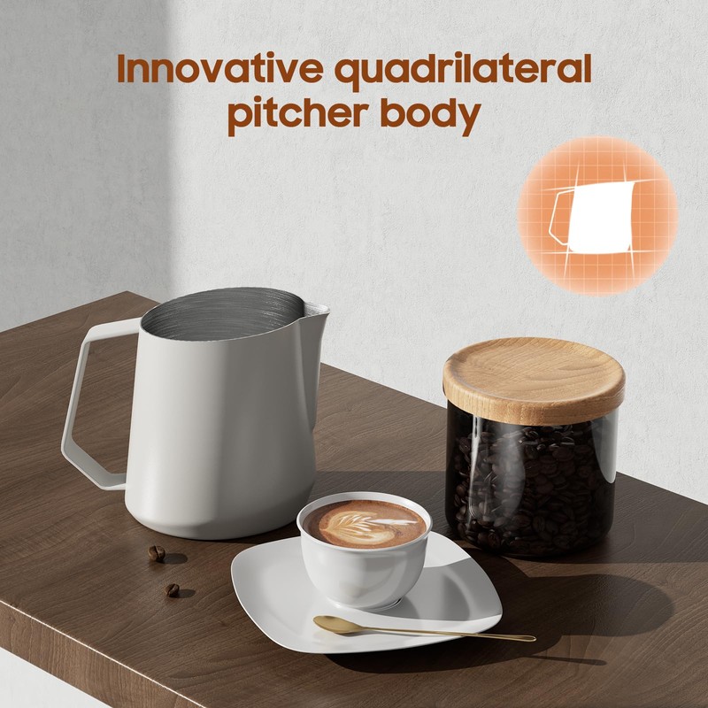 - Innovative Quadrilateral Pitcher Body: The espresso milk frothing pitcher featured with unique shape allows milk to spread over a larger area with smaller tilt angles, providing a dynamic and powerful latte art experience.