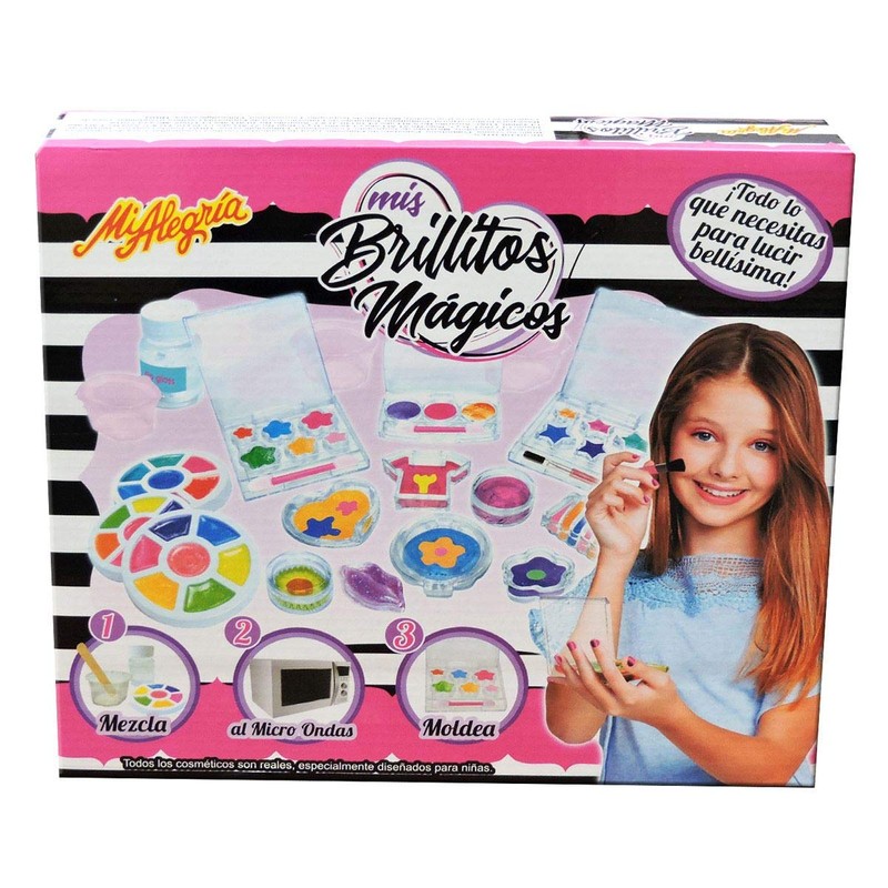 - Contenido: estuches con brillos, moldes de figuras para brillos, brochas, recipientes de plástico