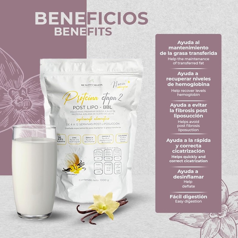 • ??Benefits: Protein for post liposuction weeks 4 to 12, helps to maintain the transferred fat, promoting hemoglobin levels recovery, prevents fibrosis, good tissue healing, reduces swelling, easy digestion with this low calorie protein powder.