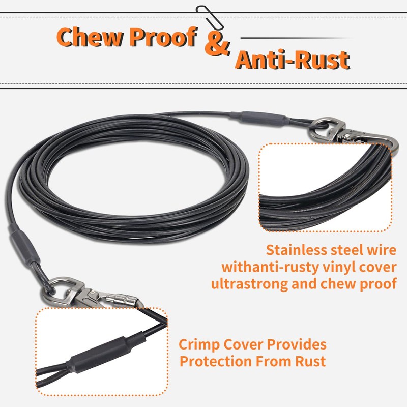 - High-Quality Cable: Engineered with steel wire rope and reinforced PVC coating, heavy duty tie-out cable delivers.Built to last with rust-proof materials for ultimate corrosion resistance,Double crimp for stronger ends,your peace of mind is guaranteed.