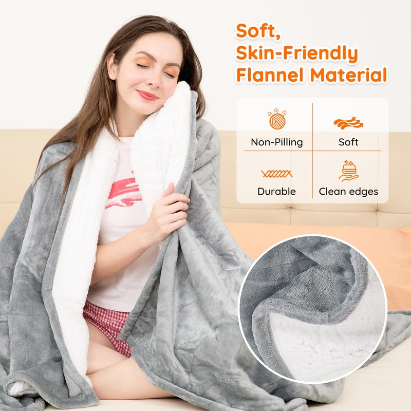 - 4️⃣【Soft and Skin-Friendly, Extra Comfort】The electric heated blanket is made of double-sided soft flannel and fluffy fleece, making it thicker and more skin-friendly than ordinary blankets, locking in warmth. The edges are perfectly stitched, making the fabric durable and lint-free. It contains no harmful substances and is skin-friendly. It can be machine washed or hand washed below 86°F. It will not fade or deform after washing, keeping it soft and clean for a long time.