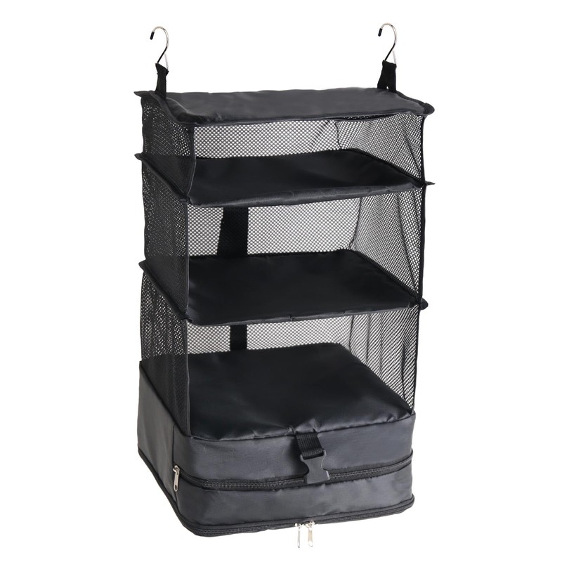 This travel closet compresses approximately 30% of your luggage for 1-2 nights of travel and is ready to hang and use like a closet.