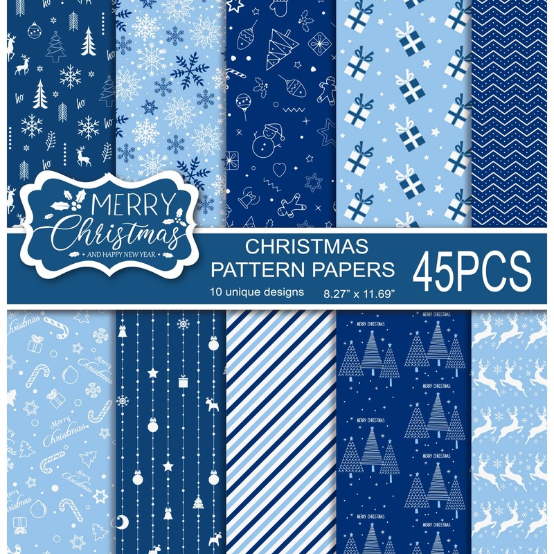 MIAHART 45 Sheets Merry Christmas Pattern Paper Set 10 Designs Festival Decorative Craft Paper Double-Sided for Card Making Scrapbook, A4 Size-Blue and White
