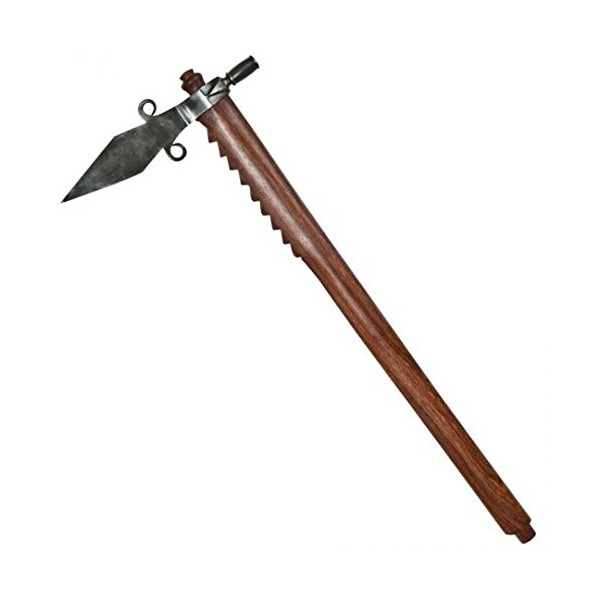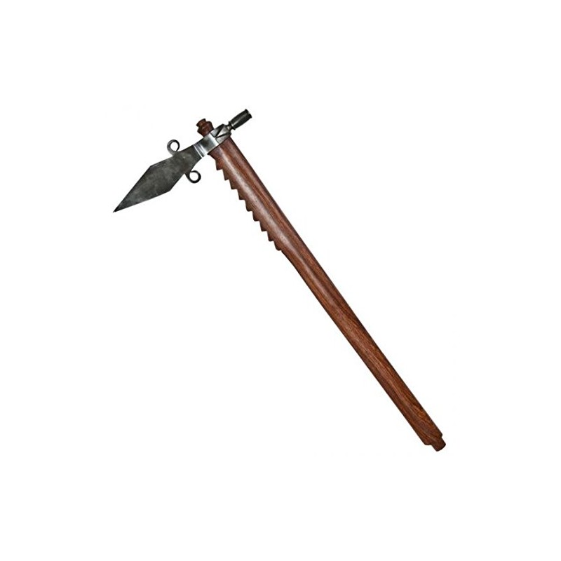 PRODUCT DETAILS This fine, new spontoon style axe is replicated from an example in our collection, with a 10" long hand-forged iron head with pipe bowl. Fitted with a striking, extra long haft of richly colored hardwood with fancy sawtooth decoration along the bottom edge. 25" long overall!