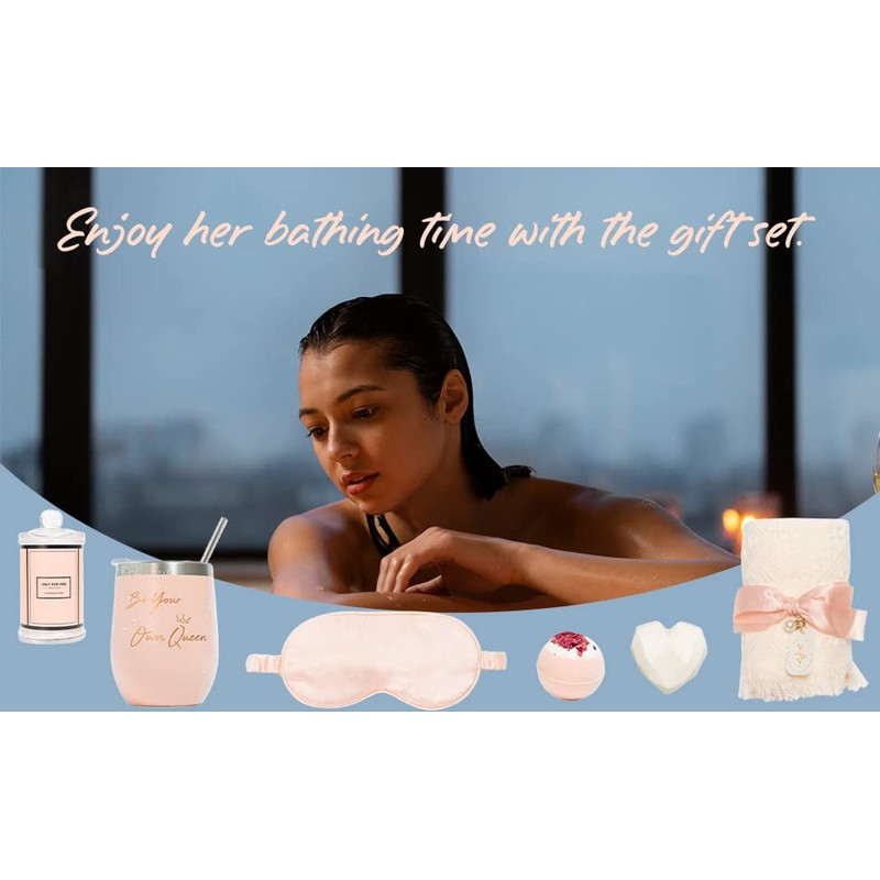 - đăAn Unforgettable Unpackingă The color of the birthday gift is unified pink. We especially customize the gift for you. Every item is unique and valuable. The gift set for women contains 8 items, one 12oz fl insulated stainless steel pink tumbler with sayings "Be Your Own Queen", Pair of "Keep Calm And Push" Cupcake socks one 80g pink rose bath bomb, one 45g off-white handmade soap, one 110g freesia scented candles, one off-white towel, one pink patch and one greeting card.