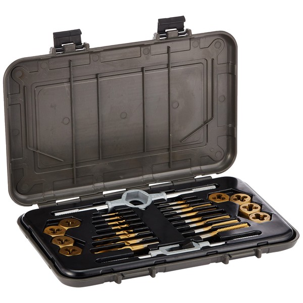 This 26-Piece Tap, Die and Drill SAE set from Mibro - a 60 plus year old company selected as one of Canada's "50 Best Managed Companies" includes 8 matching Taps, Dies and drills made of quality Tool steel and coated with Titanium Nitride for a sharper more precise cut. Also included are the adjustable Tap wrench and a hex die holder. This is a precision set of tools for use on the Farm, shop or when your car deserves the best. Always use a lubricant to prevent breakage of the new threads. If you are looking for a Metric set- try Mibro set number 301370 (26-Piece set) or 301410 (90-Piece Metric, SAE combo set).