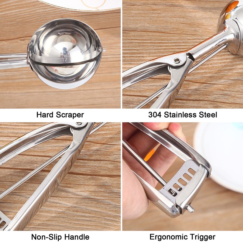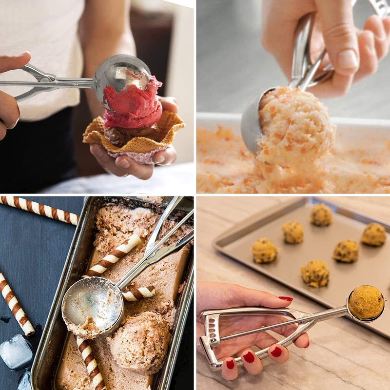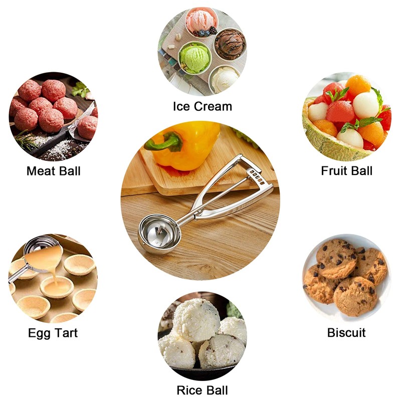 - 【 Multiple Uses】 Ice cream scoop can make beautifully rounded balls of ice cream, fruit, and meatballs, melon ball, and portioned cookies, cupcakes, muffins, and more. So, they are cookie dough scoop, ice cream scoops, melon baller and cupcake scoop also. Ice cream scooper is very suitable for use at home, restaurant, party or ice cream shop.