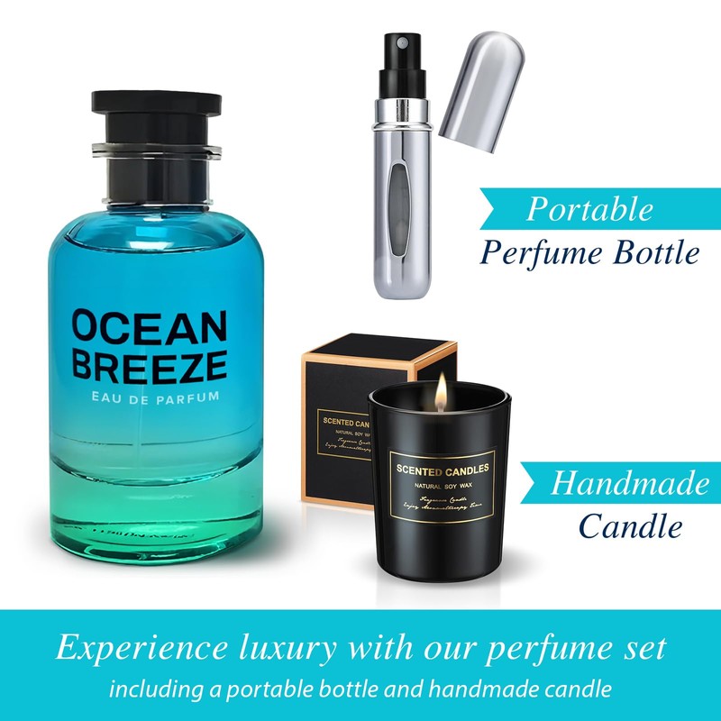 Micasa Fragrances Ocean Breeze Perfume - Eau de Parfum 3.4 oz - Gift Set Pack with Scented Soy Candle and Empty Travel Perfume Atomizer