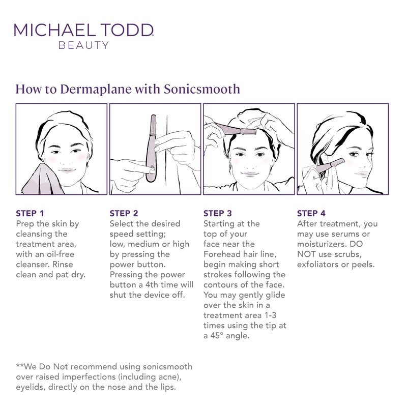 - 15,000 SONIC MOVEMENTS - Experience the instant transformation to youthful, smoother, softer, and radiant skin with Michael Todd Beauty's award-winning, at-home sonic dermaplaning system. Now with 3 times more sonic power, Sonicsmooth delivers unparalleled results. Dermatologist-approved, it offers quick, easy, and painless exfoliation and effective peach fuzz removal.