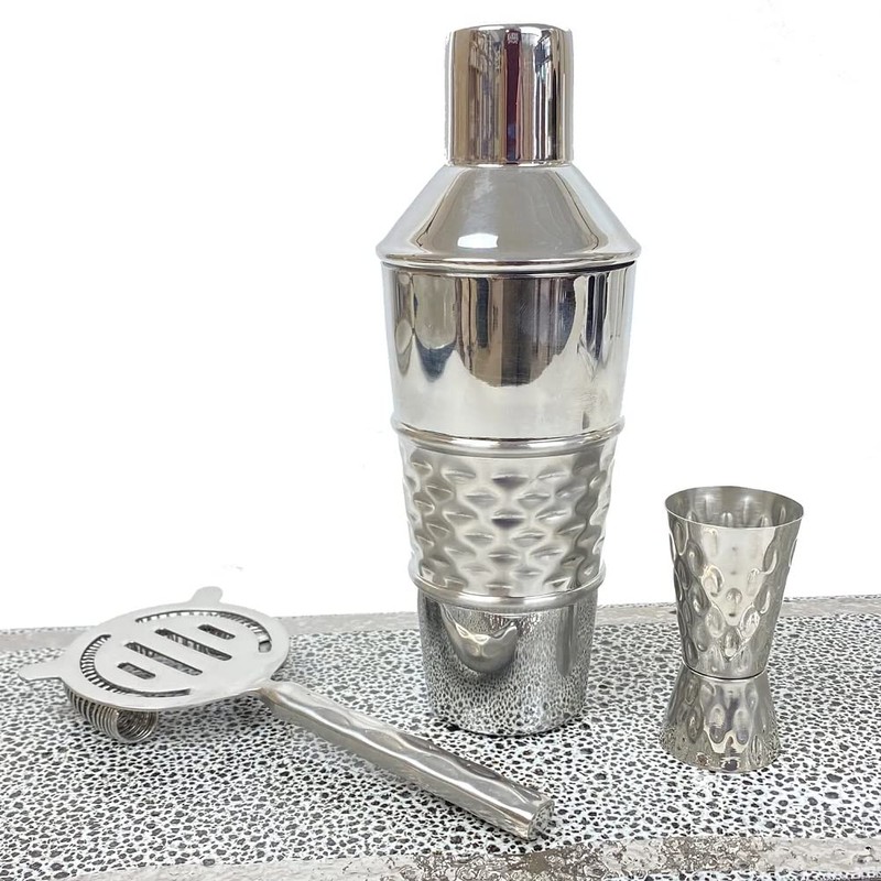 - Cocktail set includes: shaker, strainer, & jigger