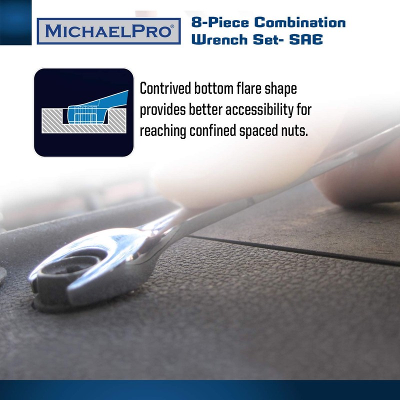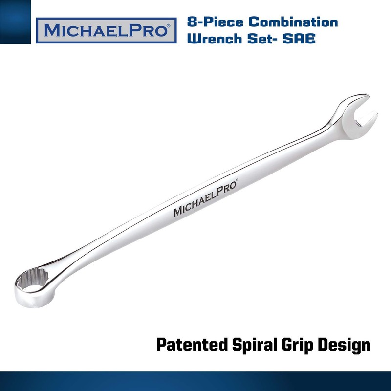 MichaelPro MP001014 8-piece SAE Combination Wrench Tool Set, Patented Spiral Grip Design Spanner Set, 15 Degree Offset Wrench Set at Open End, SAE Wrench Set for Mechanic