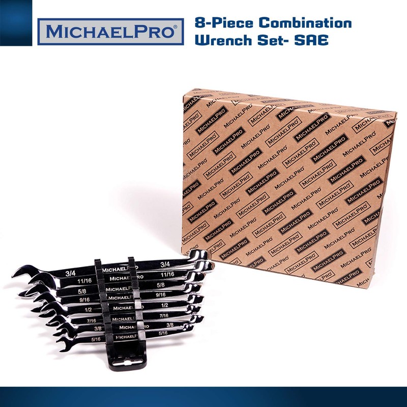 - 8-PIECE Combination Wrench Package includes (1) Each 5/16", 3/8", 7/16", 1/2", 9/16", 5/8", 11/16", 3/4" and a rack to meet various jobs. A wide collection of SAE sizes gives the user a variety of options. A must-have SAE Wrench Set for mechanic house improvement projects, collectors and engineers.