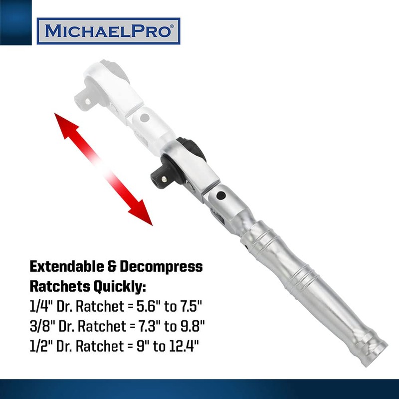 - 【MULTI-POSITION EXTENDABLE】Quickly extend or decompress your ratchets handle with the telescoping locking mechanism. The lengths for the ratchets are: 1/4" Dr. Ratchet = 5.6" to 7.5", 3/8" Dr. Ratchet = 7.3" to 9.8", 1/2" Dr. Ratchet = 9" to 12.4".