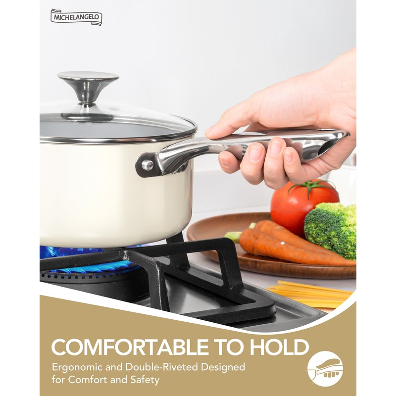 MICHELANGELO Pots and Pans Set - Nonstick Ceramic Cookware Set, 8-Piece Healthy Cooking Set, Non-Toxic, Oven Safe & Compatible with All Stovetops - Cream Pots & Pans, non toxic cookware set with stainless steel handle, non stick pot and pan set with silicone spatula and spoon. Naturally Non-Stick - Our ultra-nonstick pots and pans require less oil or butter for cooking and minimal scrubbing for a spotless clean, giving you a healthier and easy at home culinary experience. Non-Toxic Coating - MICHELANGELO ceramic cookware is free of PTFA, PFOA, Lead, cadmium and other toxic materials that can leach into your food, making them safe for you, your family, and the environment. Fast & Even Heating – Made from aluminum, these pots & pans heat evenly for faster meals. It saves you time in the kitchen while using less energy for efficient cooking. Versatile - This pots and pans set is made for any kitchen and cooktop. Use them on low to medium heat and add a dash of oil or butter for an effortless glide. Our cookware is also oven-safe up to 500ºF. Perfect Set for A Small Family - Included in this 8-piece cookware set is a 8" frying pan, 10" frying pan, 2 quart sauce pan with lid, 4 quart soup pot with lid, 2 silicone utensils.