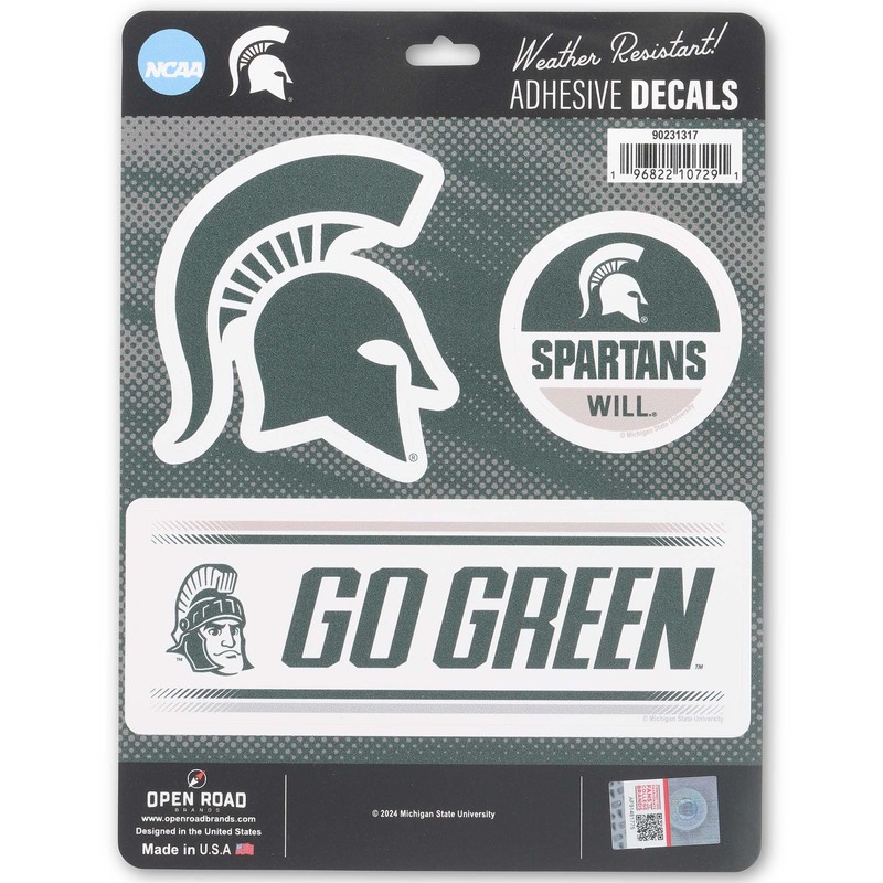 - Michigan State University Official product: Elevate your Spartan spirit with this set of 3 Michigan State decals - a trio designed to showcase your loyalty to one of college football's most iconic teams. Whether you're gearing up for game day, decorating your space, or showing your team pride on the go, these decals are the perfect way to make a bold statement wherever you are. Featuring a vibrant green color scheme, each decal brings Michigan State's legendary football spirit to life.
