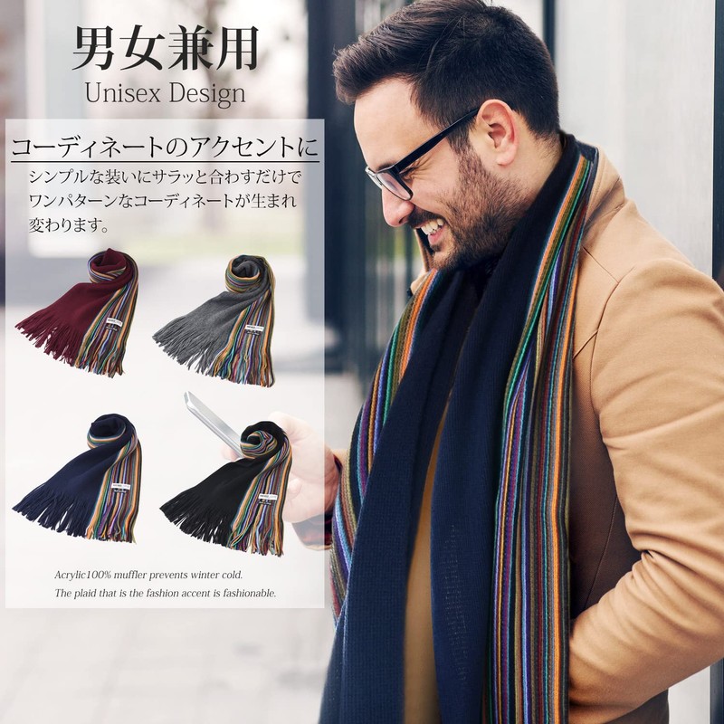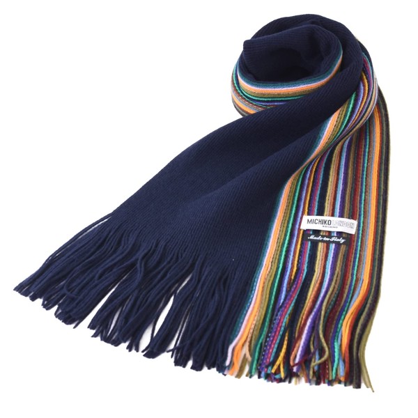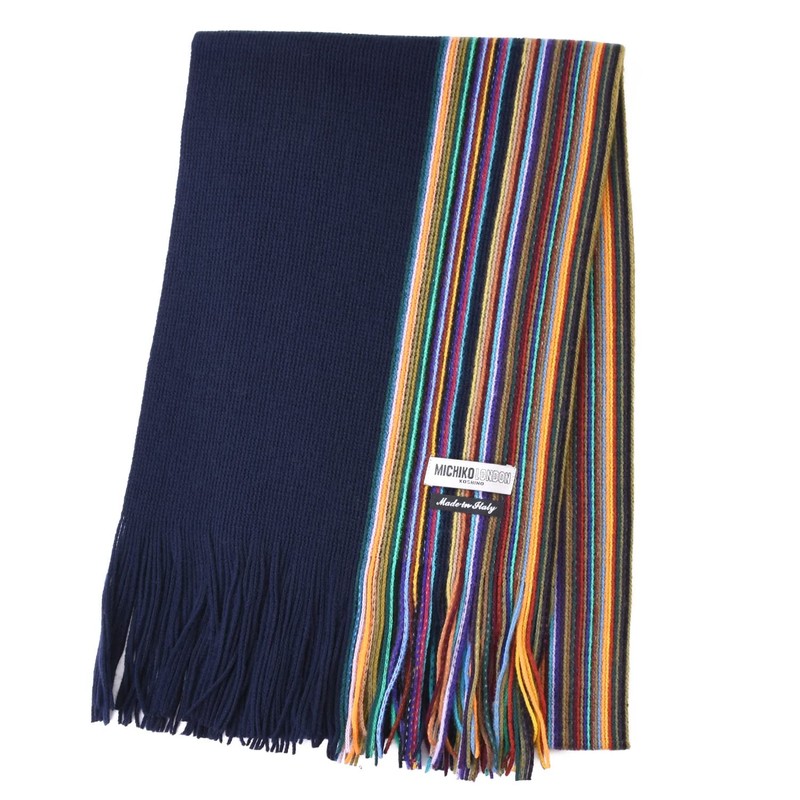 MICHIKO LONDON Brand Scarf, Made in Italy, Men's, Unisex, Ruschel Knitting, Multi-Stripe, Cold Protection, Present, (C: Navy), C: Navy