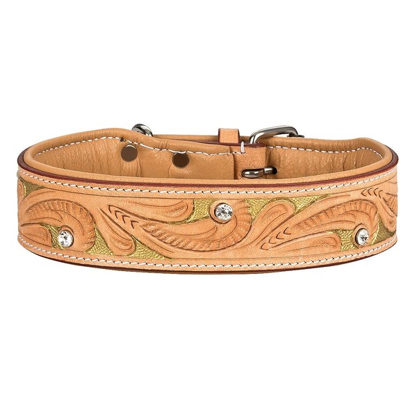 MICHUR GOLDENEYE,dog collar, leather collar, beige leather with golden press cuts and white rinestones - GERMAN BRANDNAME QUALITY!!! neck size: 24-26.7" (61-68cm), Total Length: 29.5" (75cm)