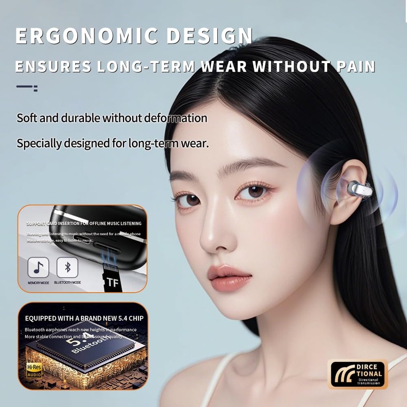 • Bluetooth 5.4 Stability & Hi-Res Sound Quality for clip on earring Earphones 🎧 Stable connection up to 15 meters ensures lag-free calls. 11mm drivers deliver rich bass and crisp highs for immersive audio quality in these wireless earbuds.