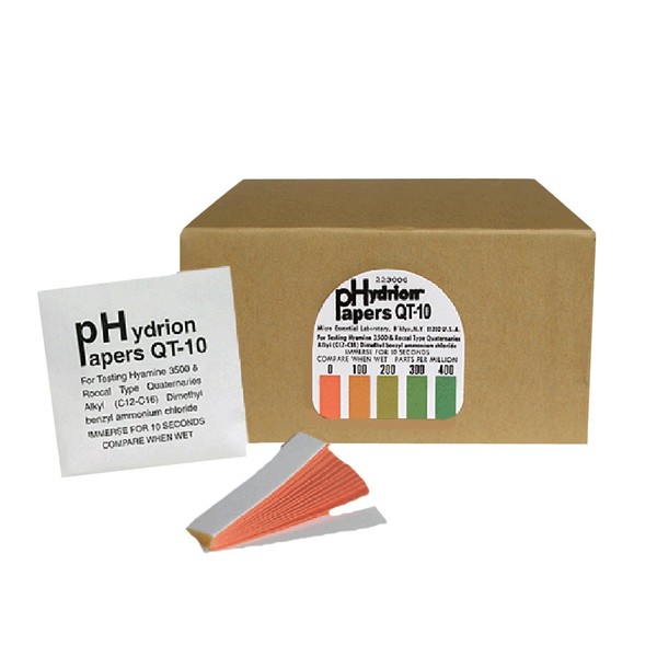 Micro Essential Lab QT-10E Hydrion Quaternary Test Paper for Quaternary Ammonia Compounds, 0 to 400 ppm Range, 100 Count