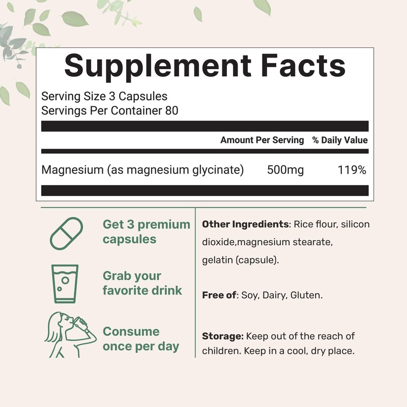 - 240 capsules per pouch that delivers an extra strength 500mg dose of pure magnesium glycinate. Every 3 capsule serving size provides an 80 day supply and promotes benefits for bones and heart, as well as supporting calmness.