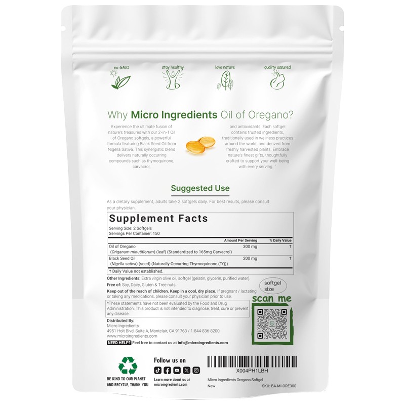 Micro Ingredients Oil of Oregano Softgels, 300 Count | 2 in 1 Formulated with Black Seed Oil, 4X Strength Carvacrol & Thymoquinone | Plant Based, Non-GMO, & Immune Support