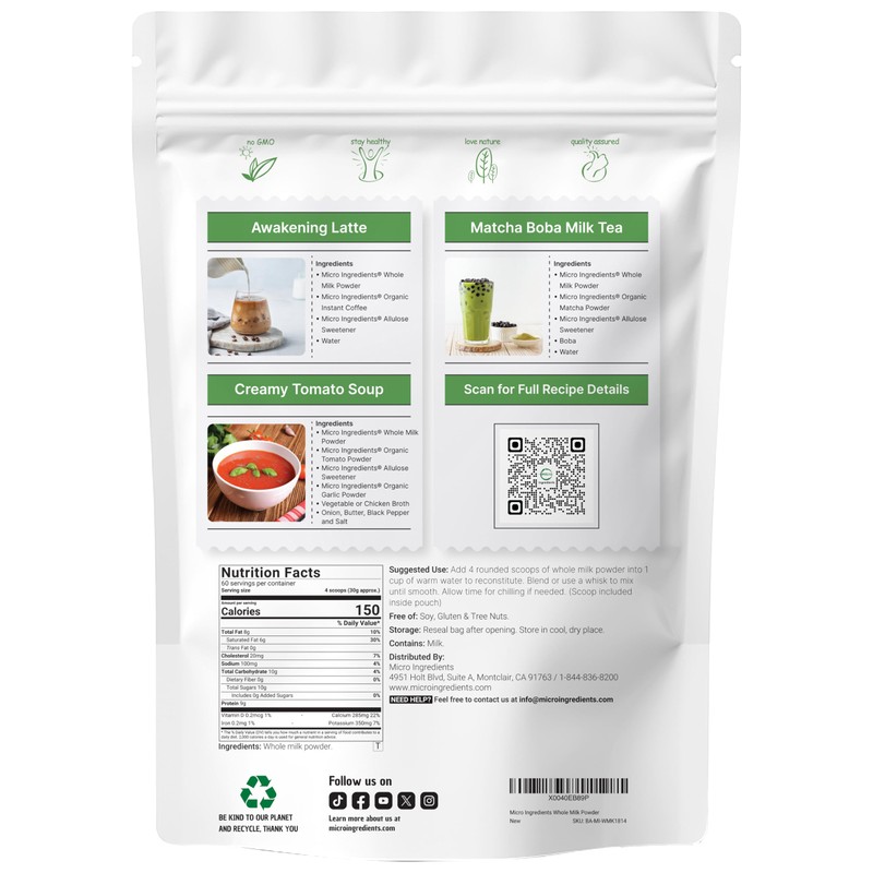 Micro Ingredients Whole Milk Powder, 4 lb | Pasture-Raised, rBST-Free | Pure & Rich in Protein | Ideal for Baking & Everyday Use | Non-GMO, Gluten-Free, Premium Grade