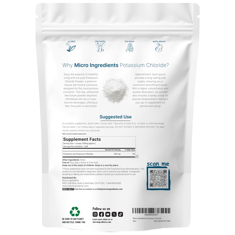 - Micro Ingredients offers 1kg (2.2lbs) of pure potassium chloride powder, an essential electrolyte supplement that is made by combining natural potassium with chloride.