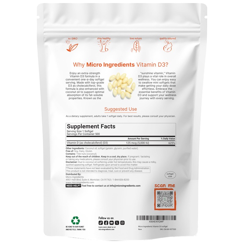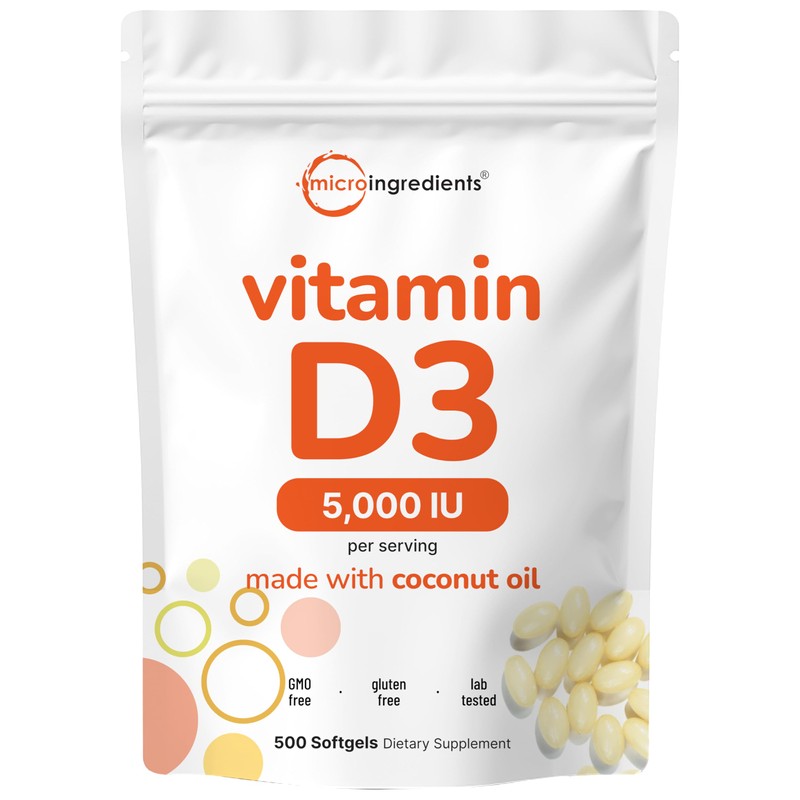 - Each pouch offers a long-lasting supply of 500 easy-to-consume mini coconut oil-infused softgels. A potent one-a-day serving size providing 5,000IU (125mcg) of Vitamin D3.