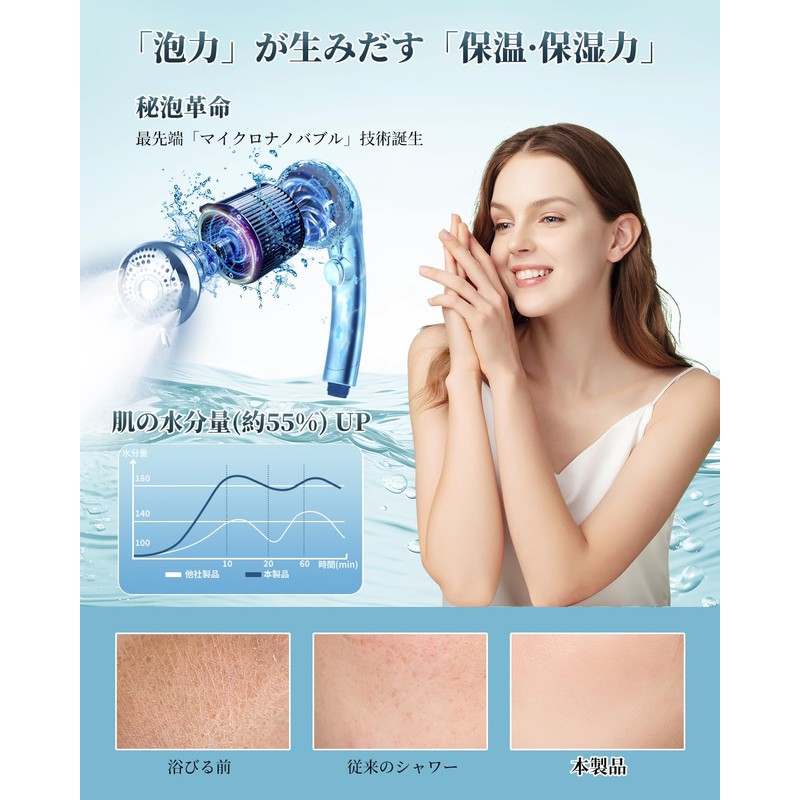 - (6 Modes for a Variety of Comfortable Showing) You can switch between 6 different water flows according to your skin area and purpose. You can use it for different purposes and for different washing areas such as face and body. 1. Massage Mode: Powerful and rhythmic water flow provides a comfortable massage experience. With hydraulic massage on the scalp, shoulders, neck, and waist, you can relax with strong stimulation from head to toe. 2. Rain + Massage Mode: Provides a pleasant stimulation, and lifts the sebum and sweat that is clogged in the pores. Wash it in the shower. 3. Rain Mode: Water drops containing air, saving water and providing a satisfying bathing experience. Gently wraps around your body and mind. 4. Rain + Mist Mode: The ultra-fine bubbles and moderate water pressure ensure that you wash your pores deep on the days of sweating a lot. For sensitive skin to children and pets. 5. Mist Mode: Rinse gently and gently as bubbles encapsulate much finer than pores. It is less irritating to the skin, so it is recommended to use it on your face. 6. Jet Mode: Strong water pressure provides a strong cleaning power and saves water, while also allowing you to quickly wash away any unwanted stains on the scalp. Also convenient for cleaning toilets, bathrooms, corners, etc