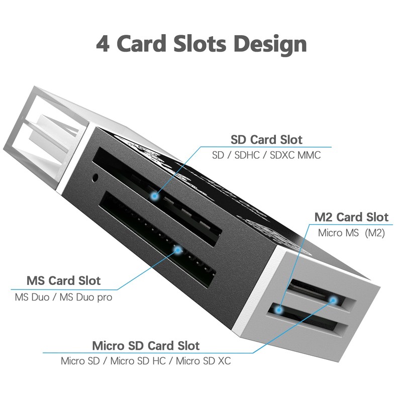 - 【4 Card Slots Design】 - This usb sd card reader has SD, microSD, MS Duo and M2 card slots, It could easily transfer the file you need between different devices or review the photos/videos quick.