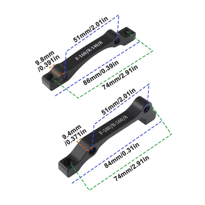• Product size: Front Fork Mount is 86mm long, 9.8mm thick, and the two hole distances are 51mm and 74mm respectively; Rear Fork Mount is 84mm long, 9.4mm thick, and the two hole distances are 51mm and 74mm respectively. Manual measurements, please allow slight errors.