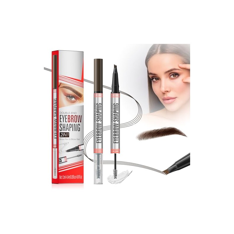 Microblading Eyebrow Pen - 2-in-1 Dual-Ended with 4-Fork-Tip & Eyebrow Brush and Sealing Brow Gel, Creates Natural Looking Brows Effortlessly (Dark Brown)