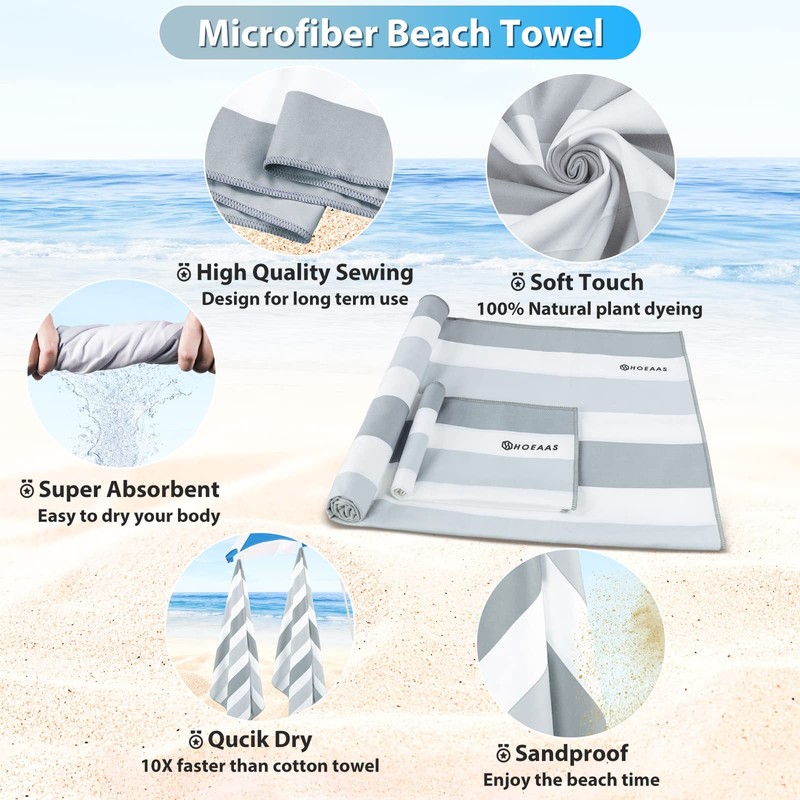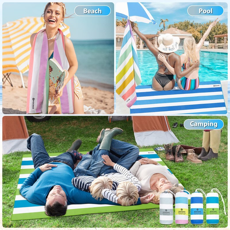 - Quick Dry & Absorbent Material:Our beach towel is made of Microfiber towels,super absorbent material.These quick-drying beach towels are 3 times faster than regular towels.You can use it in any occasion without worrying about its quality.Our beach towels are soft and smooth will never fade and shrink in water.The colors will stay just as they are!The microfiber towels for beach can be also as a travel towel or pool,swim,bath,yoga,camping,picnic,outdoor&sport.