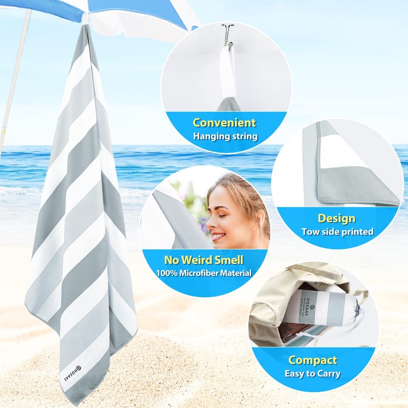 - Quick Dry & Absorbent Material:Our beach towel is made of Microfiber towels,super absorbent material.These quick-drying beach towels are 3 times faster than regular towels.You can use it in any occasion without worrying about its quality.Our beach towels are soft and smooth will never fade and shrink in water.The colors will stay just as they are!The microfiber towels for beach can be also as a travel towel or pool,swim,bath,yoga,camping,picnic,outdoor&sport.