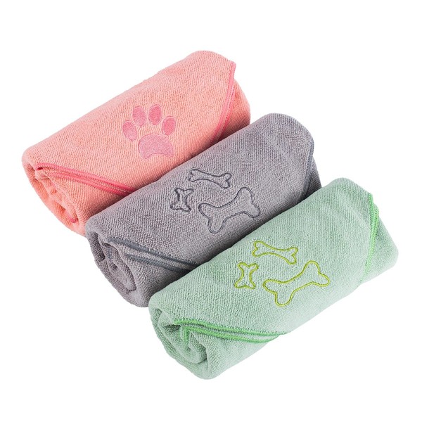 - CUTE DESIGN: The 3 fun colors in the microfiber dog and cat towel pack make it easy to match your pet's mood, or if you have multiple pets, each one can get their favorite color, from pink, green, or gray! The cute paw or bones embroidery on each pup microfiber bath towel will ensure that you won't use a drying towel for yourself by mistake! Your dog will look extra adorable using these large microfiber towels! A dog drying towel makes the perfect gift for any pet owner.