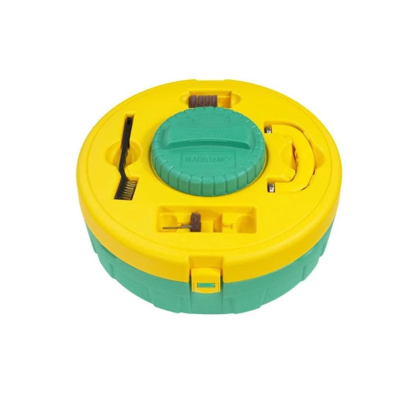 The BLADECLEAN System is an all-in-one solution designed to clean saw blades and router bits faster and easier than ever before. The included magnetic handle allows you to lift and move blades more safely, and the custom designed scouring pad cleans an entire side of a blade in a single motion, all without dangerous chemicals. That means no more tediously brushing individual teeth. Start to finish, users can clean a 7-1/2'' to 12'' diameter saw blade in under a minute. A simple solution of water and common household cleaner can be safely stored in the sealed cleaning well for later re-use. The locking lid features an additional well for storing and soaking router bits. Also included are 6 small scouring discs and a custom heavy-duty mandrel specifically designed to clean router bits quickly with a common rotary tool or power drill. The discs are replaceable in packs of 14, and are also useful for cleaning and restoring other metal items in the shop, such as chisels, planes, and a variety of other hand tools. Clean saw blades in under a minute without harsh chemicals Make cleaner cuts, avoid unnecessary sharpening, and extend the lifespan of your saw blades Quickly clean, polish, and restore router bits, chisels, planes, and a variety of hand tools with a common rotary tool